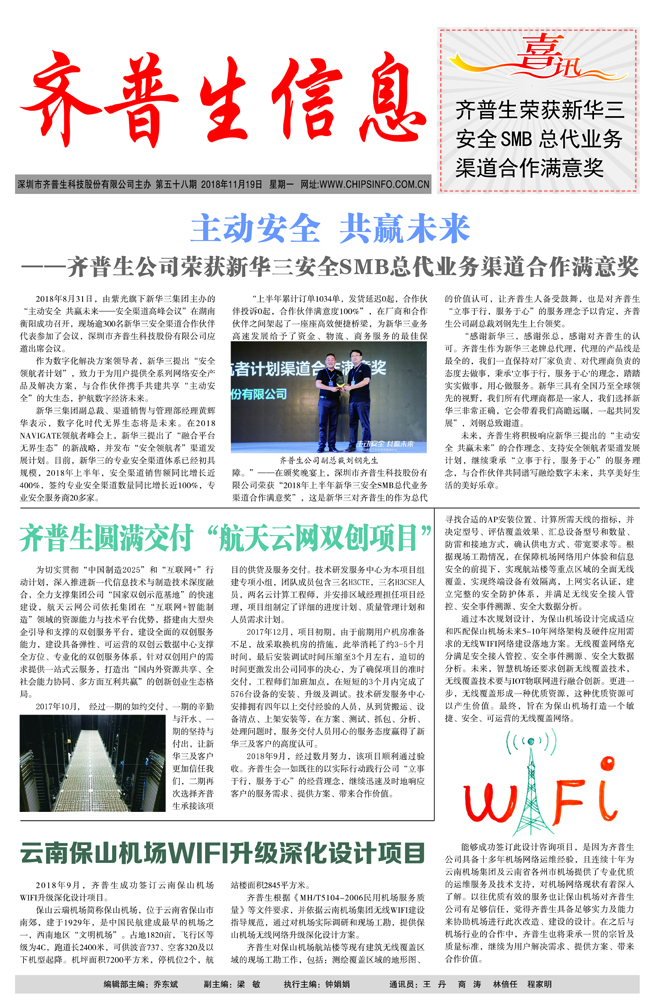 • 主動(dòng)安全 共贏未來(lái) ——齊普生公司榮獲新華三安全SMB總代業(yè)務(wù)渠道合作滿意獎(jiǎng) 2018-11-29
