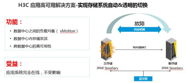 對(duì)于這一點(diǎn),新華三推出了應(yīng)用高可用解決方案。這一方案的重點(diǎn)就是實(shí)現(xiàn)存儲(chǔ)系統(tǒng)自動(dòng)、透明的切換。通過數(shù)據(jù)中心之間的負(fù)載均衡、數(shù)據(jù)中心內(nèi)存儲(chǔ)雙活、跨數(shù)據(jù)中心的高可用性等功能,讓金融應(yīng)用系統(tǒng)可以忽略外部故障影響,完全在線。