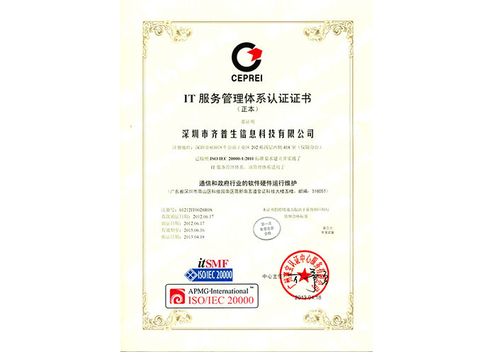 • ISO/IEC 20000 IT服務(wù)管理體系認(rèn)證證書